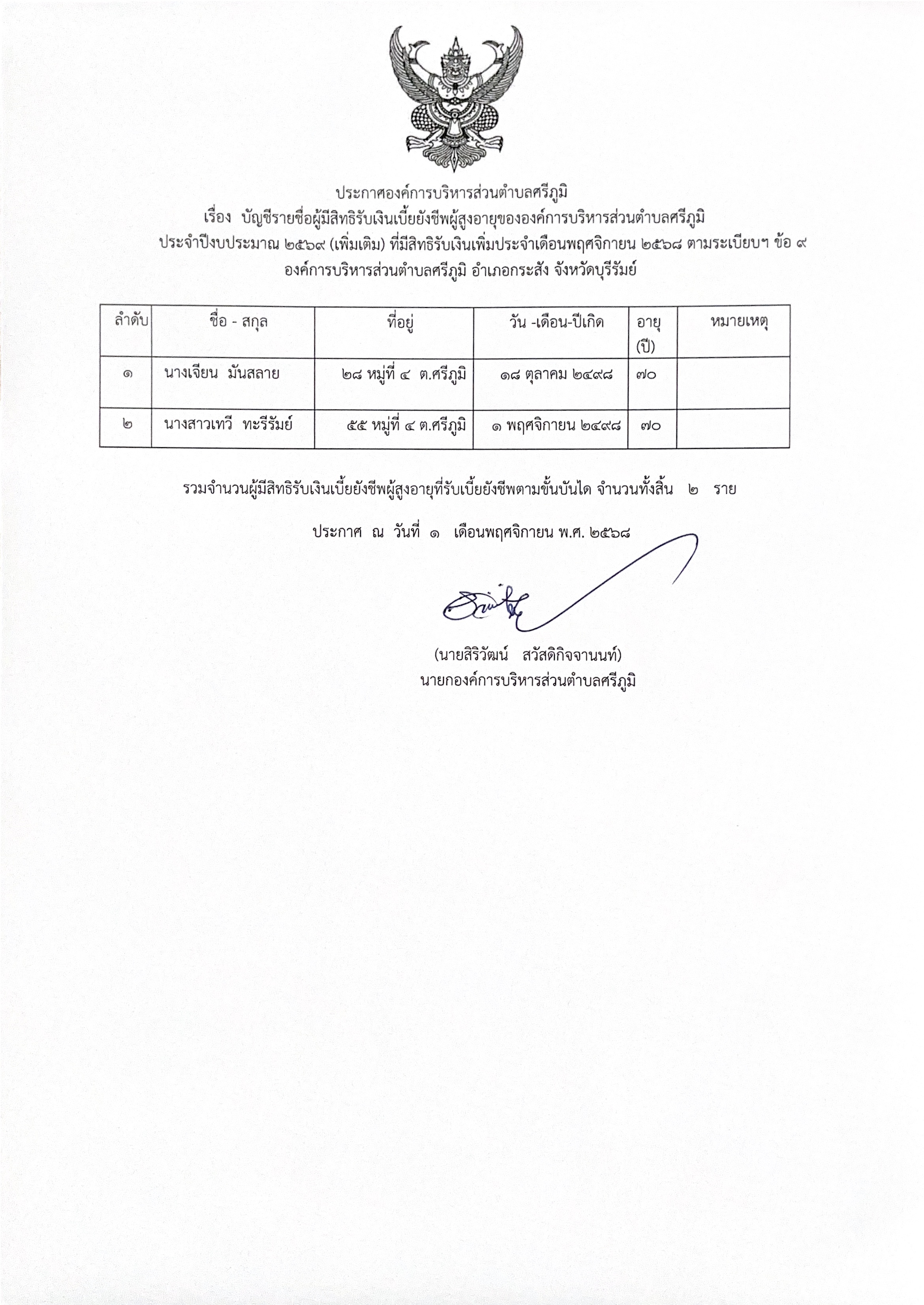 บัญชีรายชื่อผู้มีสิทธิรับเงินเบี้ยยังชีพผู้สูงอายุขององค์การบริหารส่วนตำบลศรีภูมิ ประจำปีงบประมาณ ๒๕๖๙ (เพิ่มเติม)